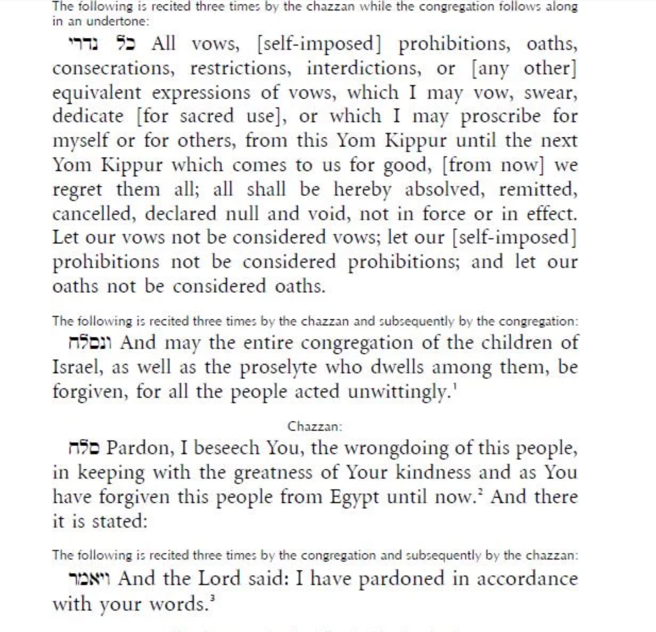 Kol Nidre prayer as recited on Yom Kippur (English translation. The words Kol Nidre are on the upper left.)