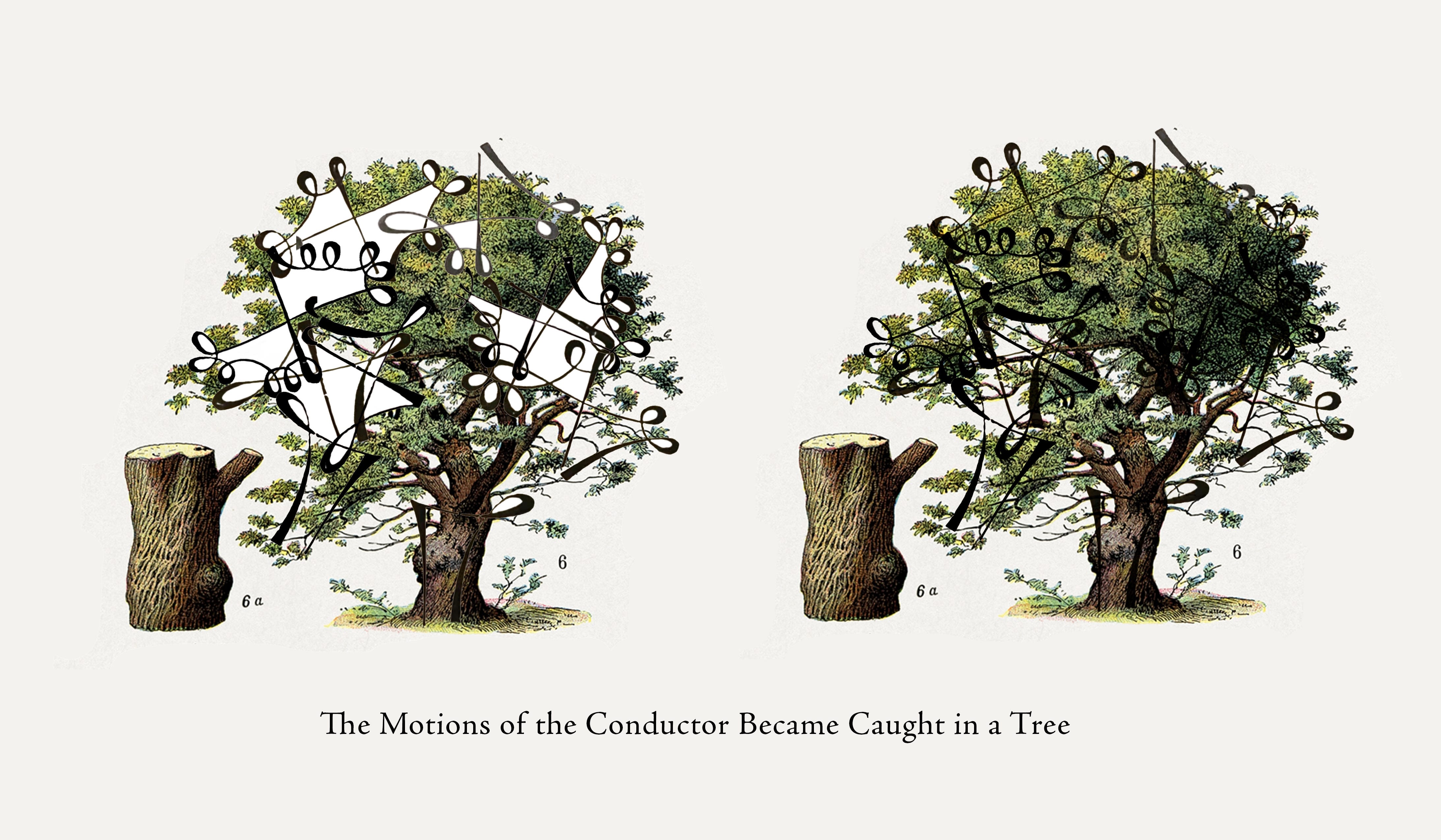 I made the above image by weaving glyphs representing the conducting patterns conductors use to mark varous time signatures into these images of a tree. Are the marks the paths of squirrels and birds? Of moving branches, the paths of the wind? The route my eyes take as I look, the curling of scent or light?